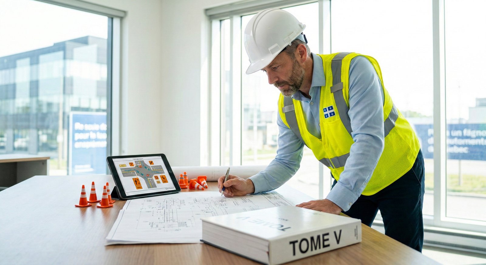 Les exigences applicables au Québec, notamment celles du Tome V – Signalisation routière, encadrent la signalisation de travaux. Une implantation conforme facilite les échanges avec les autorités et protège la responsabilité du maître d’œuvre.